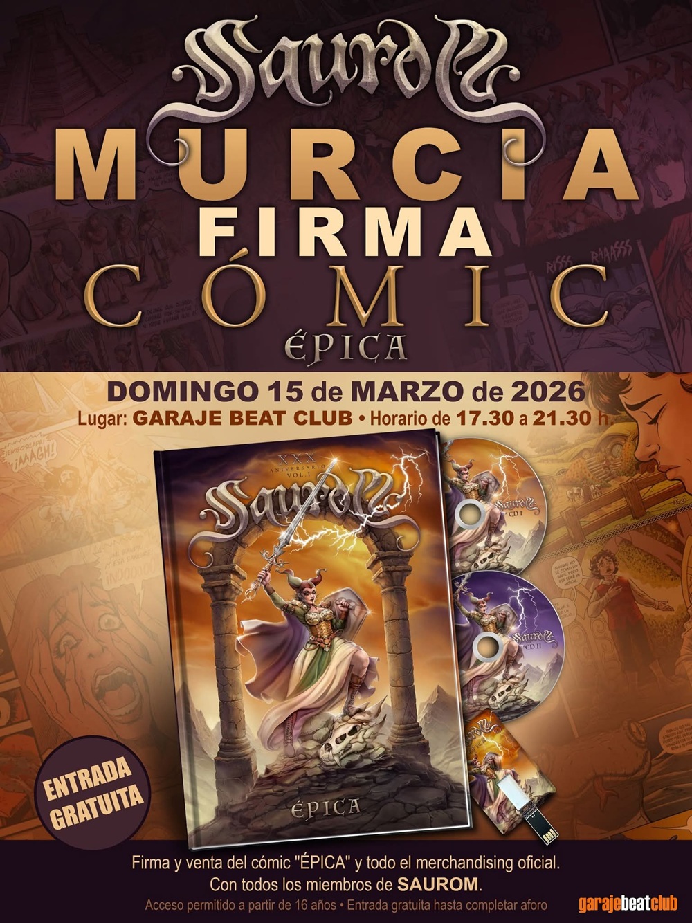 Al día siguiente, Briones y otros artistas -entre los que se cuenta también la autora de cómics Gema Over, invitada en el episodio 3 de LOS HOMBRES DEL TIEMPO– que han participado en la obra firmarán ejemplares de Épica, el cómic de la banda Saurom, en la ciudad de Murcia a lo largo de la tarde. Tendrá lugar en un acto celebrado en la sala Garaje Beat Club donde además del propio cómic también se podrá adquirir merchandising oficial de la banda.
